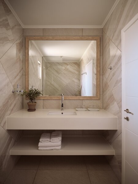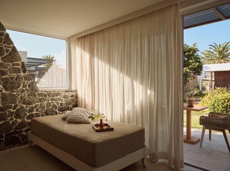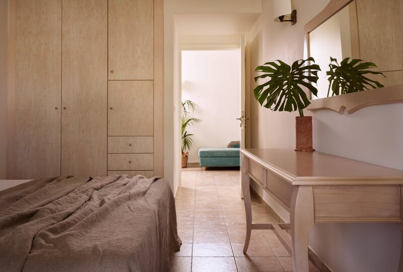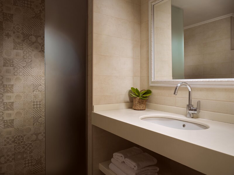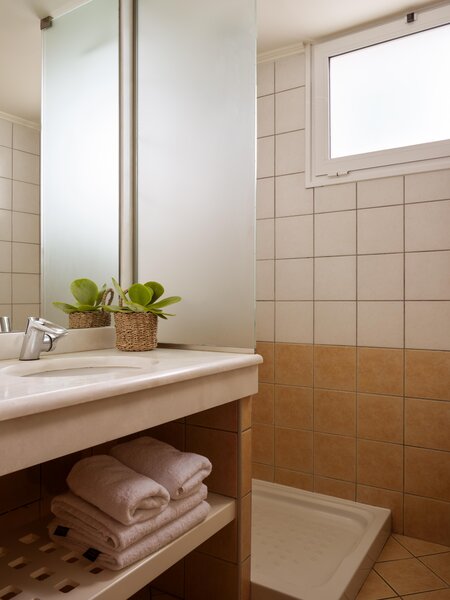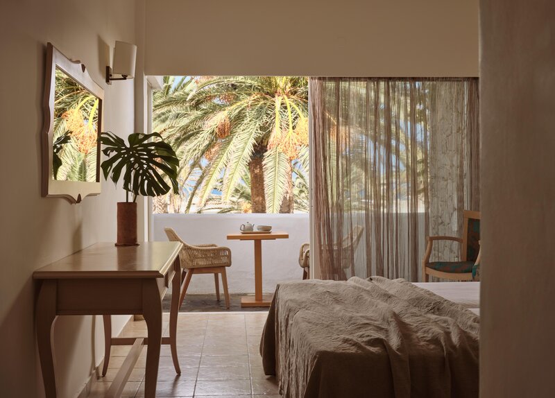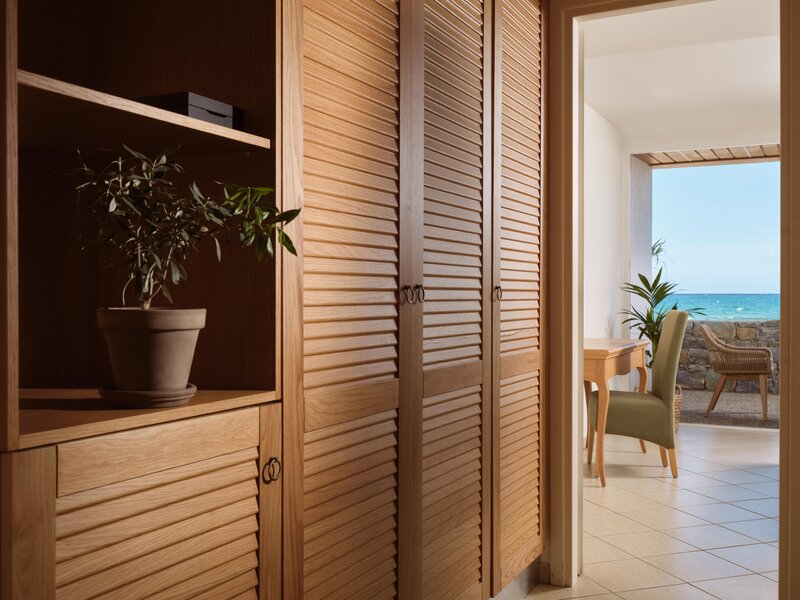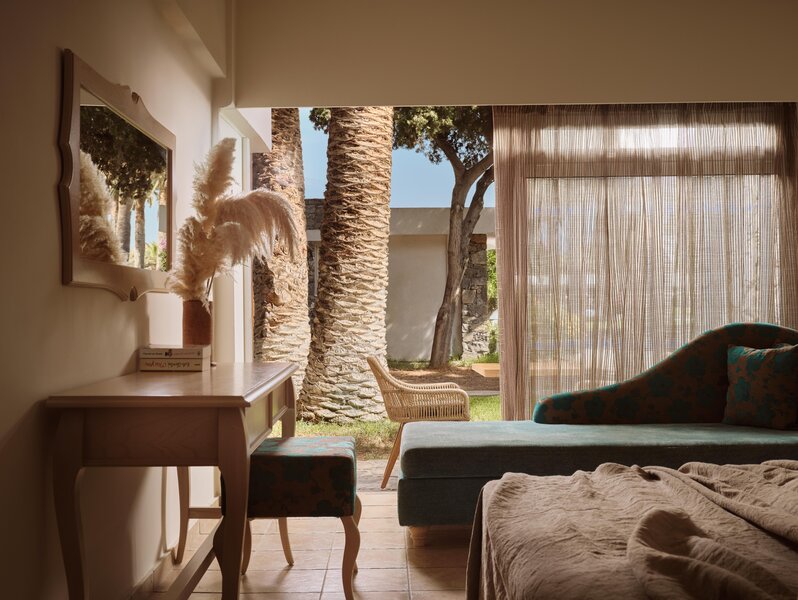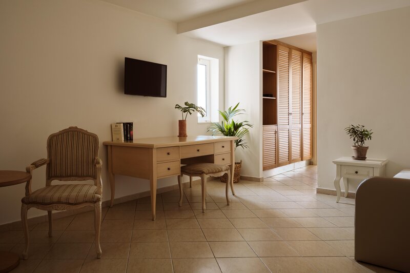 Junior suity (JS, cca 35 m²; pozri HER549), klimatizácia, minichladnička, TV, Wi-Fi, trezor na prenájom. Sprcha, WC a fén. Terasa s výhľadom na more, blízko pláže. Max. 4 dospelí.