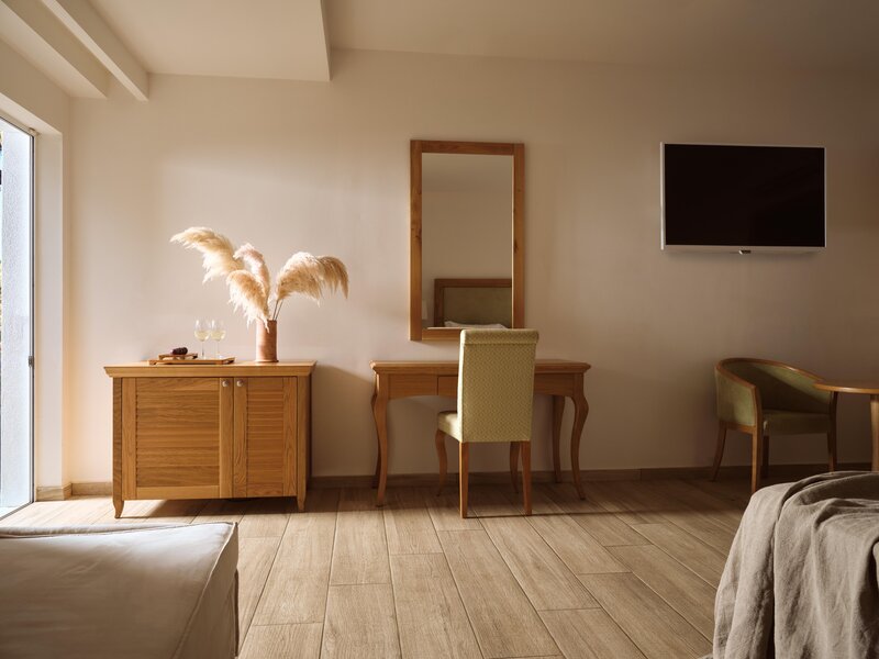 Rodinná izba (cca 35 m²), klimatizácia, minichladnička, telefón, TV, Wi-Fi, trezor na prenájom. Kúpeľňa/sprcha, WC, fén. Balkón/terasa s výhľadom do záhrady. Max. 4 dospelí.