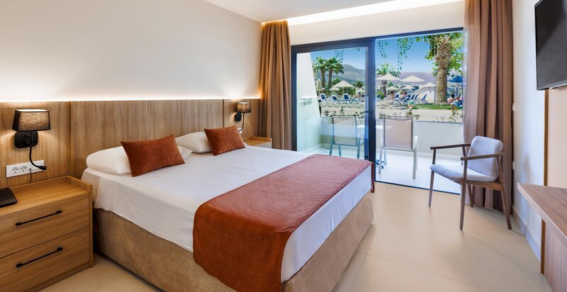 Superior-Doppelzimmer (DMS, ca. 26-30 qm), komplett renoviert, großzügig und geschmackvoll eingerichtet, Klimaanlage (warm/kalt), Minikühlschrank, TV, Telefon, WLAN, Mietsafe. Halb offenes Bad mit bodengleicher Dusche, sep. WC, Föhn. Balkon/Terrasse. Meerblick.