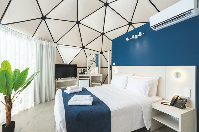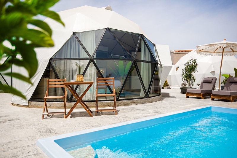 Kupola so súkromným bazénom: Moderné kupoly ponúkajú všetko pohodlie a sú vybavené sprchou/WC, zrkadlom na toaletu, toaletnými potrebami, sušičom vlasov, manželskou posteľou (160x200 cm), individuálnou klimatizáciou/kúrením, Wi-Fi pripojením (v cene), telefónom s priamou voľbou, trezorom (v cene), 42-palcovou inteligentnou TV, minichladničkou, príslušenstvom na prípravu kávy/čaju/kanvicou (denne dopĺňaná 4 baleniami kávy Nescafé a 4 baleniami čaju na jednotku), dvoma veľkými 1-litrovými fľašami vody pri príchode, veľkou otvorenou skriňou, zrkadlom a zatemňovacími závesmi. Dvere kupoly majú moskytiéru a terasa je vybavená pohodlným sedacím nábytkom so stolom a stoličkami, dvoma ležadlami a slnečníkom. Každá ubytovacia jednotka má vlastný súkromný bazén (D/DR). K dispozícii je aj pre jednu osobu (DE).