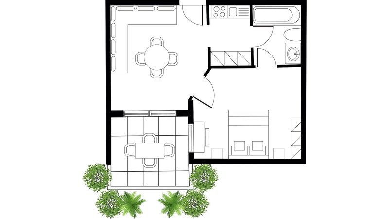 Casa Family 1 spálňa: Priestranné apartmány „Casa Family“, ktoré sa nachádzajú v štvrti Casa Adele, sa nachádzajú na prízemí, 1. alebo 2. poschodí a sú vybavené kombinovanou obývacou/spacou časťou s dvoma samostatnými lôžkami, satelitnou TV, bezplatným Wi-Fi pripojením na internet, jedálenským kútom s kuchynským kútom, chladničkou a príslušenstvom na prípravu kávy/čaju, trezorom, ako aj samostatnou spálňou s manželskou posteľou alebo samostatnými lôžkami, kúpeľňou so sprchovacím kútom/WC a sušičom vlasov a balkónom alebo terasou s výhľadom do záhrady (2FS).