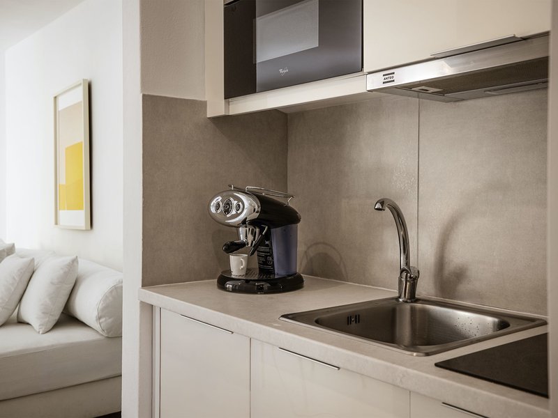 White Studio: Die komfortablen "White Studios", im Viertel Casa Serena gelegen, befinden sich im im Erdgeschoss und sind ausgestattet mit einem kombinierten Wohn-/Schlafraum mit zwei Einzelbetten, Sat.-TV, kostenfreiem Wi-Fi, Klimaanlage, Essbereich mit Kochnische, Kühlschrank und Kaffee-/Teezubereitungsmöglichkeit, Safe sowie einem separaten Schlafzimmer mit Doppel- oder Einzelbetten, einem Badezimmer mit Badewanne/WC und Föhn und eine Terrasse mit Blick auf den Garten (AST).