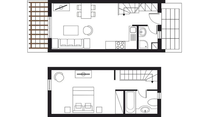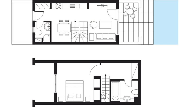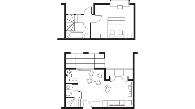 Loft Maisonette 1 Schlafzimmer: Die luxuriösen, auf zwei Ebenen aufgeteilten Zimmer "Loft Maisonette 1 SZ", im Stadtteil Villa Adele gelegen, befinden sich in der 1. oder 2. Etage und sind ausgestattet mit einem kombinierten Wohn-/Schlafraum mit zwei Einzelbetten, zwei LCD-Sat.-TVs, kostenfreiem Wi-Fi, Essbereich mit Kochnische, Kühlschrank und Kaffee-/Teezubereitungsmöglichkeit, Safe sowie einem separatem Schlafzimmer mit Doppel- oder Einzelbetten, einem Badezimmer mit Badewanne/WC und einem weiteren Badezimmer mit Dusche/WC und Föhn und einer Terrasse mit Blick auf den Garten (TM2).