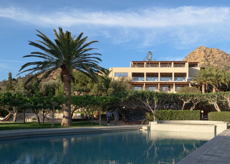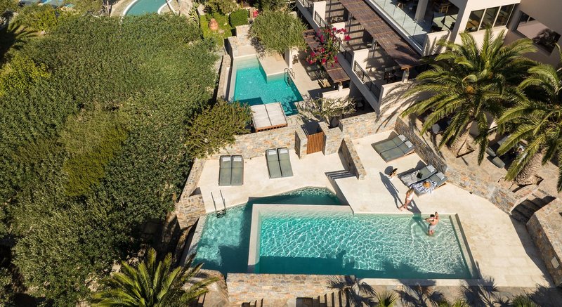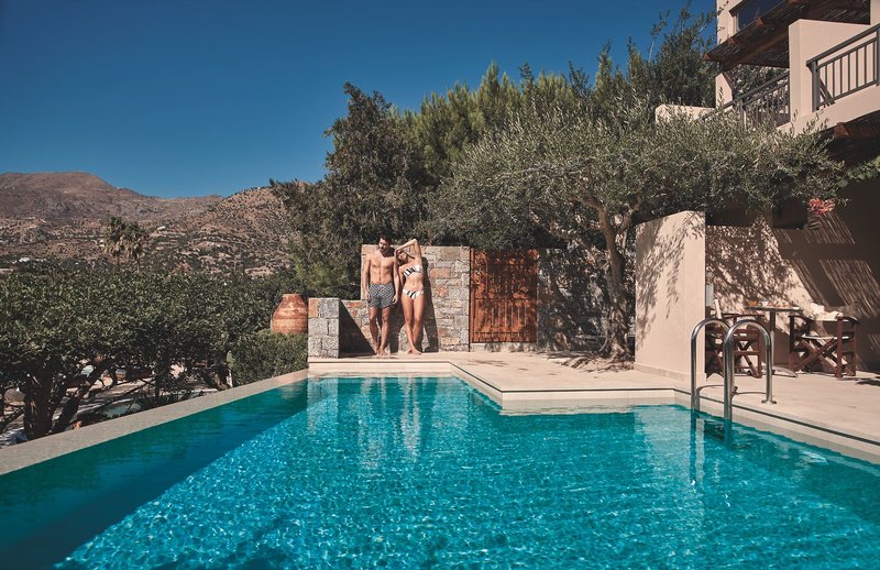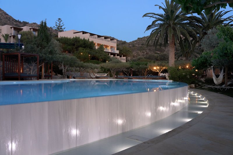 Okolo troch veľkých bazénov s poloslanou vodou (jeden s vírivkou, jeden ako relaxačný s nekonečným výhľadom na Agia Galini) sa rozprestierajú palmy, olivovníky a rohovníky. Bazén je obohatený o horčík, ktorý je obzvlášť dobrý pre vlasy, pokožku a zdravie. K dispozícii je tiež detský bazén v záhradách, ako aj bar pri bazéne so slnečnou terasou a trávnikom na opaľovanie. Bazény sú čistené na ekologickej báze pomocou systému elektrolýzy soli. Ležadlá, altánky a bazénové osušky sú tu k dispozícii zdarma. Ležadlá na pláži sú k dispozícii od miestnych poskytovateľov za poplatok.