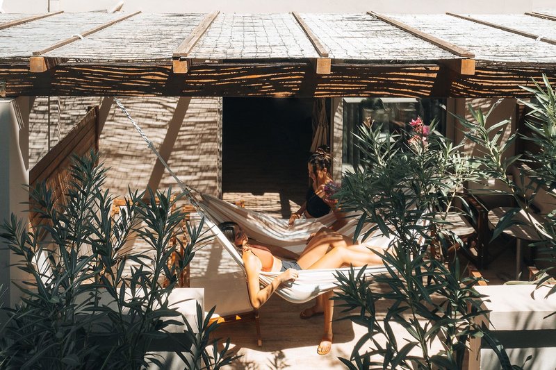 Junior Suite Chill: Die Junior Suiten "Chill" sind im Erdgeschoss gelegen und mit warmen natürlichen Farbtönen und Materialien ausgestattet. Jedes Zimmer hat einen eigenen, privaten Garten mit Liegen und einer gemütlichen Hängematte.