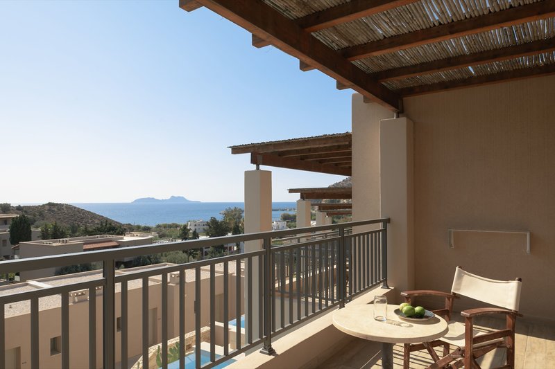 Junior Suite s výhľadom na more: Tieto novo zariadené izby sú vybavené centrálne ovládanou ekologickou klimatizáciou, stropným ventilátorom, kúpeľňou so sprchovacím kútom/WC, toaletnými potrebami, sušičom vlasov, zrkadlom v plnej výške a kozmetickým zrkadlom, kávovarom (štyri kapsuly v cene pri príchode), kávovarom/čajovým setom, rýchlovarnou kanvicou, Wi-Fi pripojením (v cene), zvukotesnými oknami a dverami, telefónom, 42-palcovým LED televízorom, elektrickým trezorom, minichladničkou, fľašou vody na izbe pri príchode, výberom vankúšov a balkónom (J2M, max. obsadenosť 3 osôb na 2 samostatných lôžkach a rozkladacej pohovke).