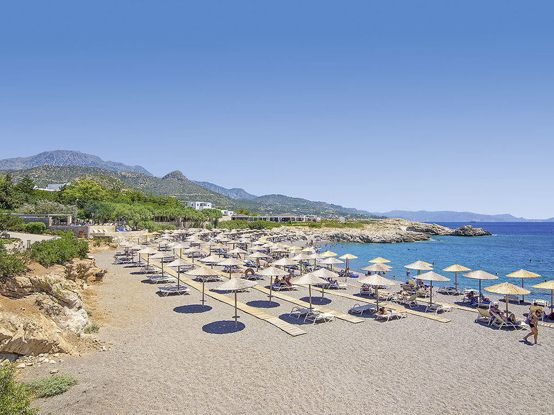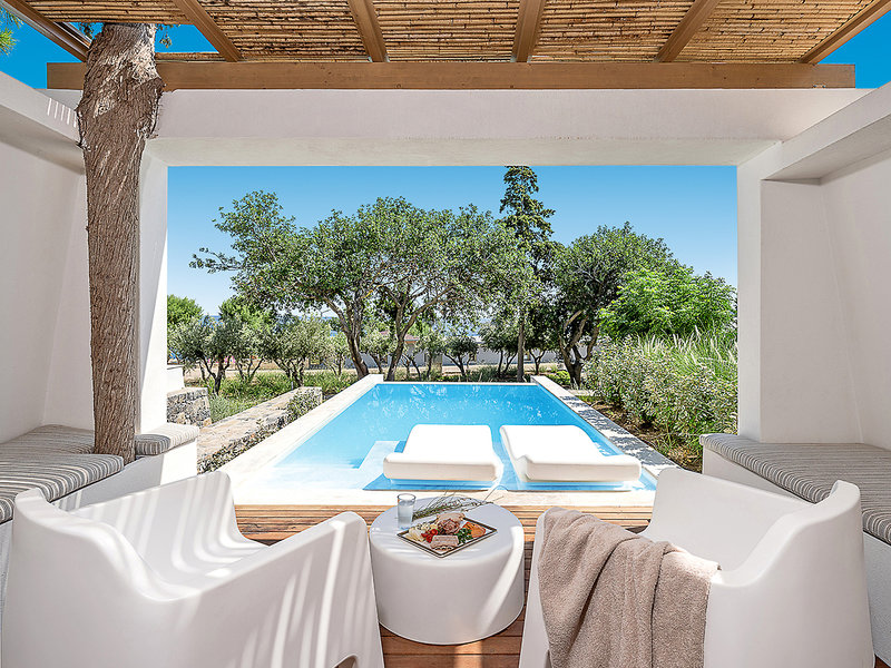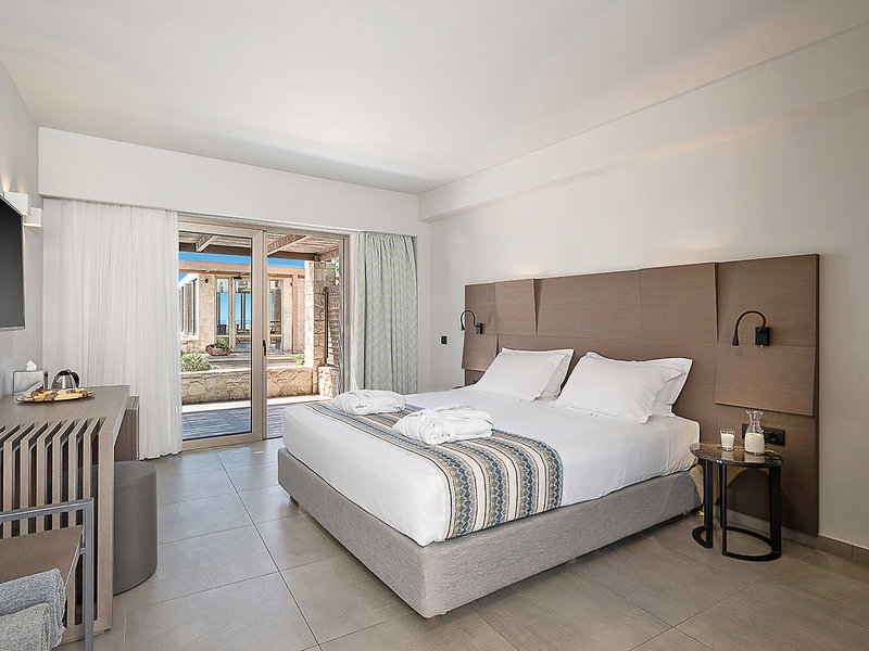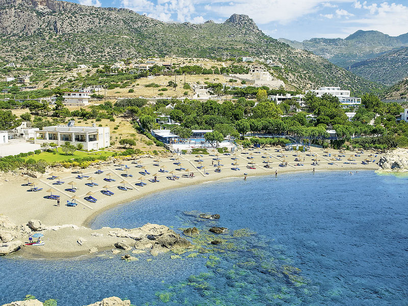 Ausstattung: Persönlich geführtes Hotel mit einem Haupthaus und mehreren Bungalowgebäuden. Zum Sommer 2022 wurden umfangreiche Renovierungen abgeschlossen (Lobby, Restaurant, Bar, Außenbereiche sowie neue Zimmer mit privatem Pool). Sonnenterrasse mit Swimmingpool, Liegen, Sonnenschirmen, Badetüchern, Poolbar. Oberhalb der Badebucht weiterer Pool mit Poolbar und Sonnenterrasse mit Meerblick. Gemütliche, im griechischen Stil gehaltene Taverne direkt an der Badebucht gelegen. Im Haupthaus Empfangshalle, Rezeption, Lobby, Internetecke, WLAN, Restaurant, Bar, Minimarkt. Landeskategorie: 5 Sterne, 84 Zimmer, 2 Etagen.