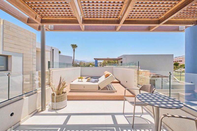 Junior apartmán Pure Luxe s výhľadom do záhrady: Komfortné junior apartmány (JS2; ďalšie izby si môžete rezervovať pod hotelovým kódom HER201: J2A) sú vybavené manželskou posteľou veľkosti king-size, 50-palcovým smart TV, individuálne nastaviteľnou klimatizáciou a kúrením, telefónom, trezorom s integrovanou zásuvkou (veľkosť notebooku), nealkoholickým minibarom (rôzne nealkoholické nápoje; denné dopĺňanie v cene pri rezervácii all inclusive), zariadením na prípravu kávy a čaju, kávovarom Nespresso (denné dopĺňanie 4 kapsúl v cene), kúpeľňou so sprchovacím kútom s dažďovou sprchou/toaletou, toaletnými potrebami, županmi a papučami, sušičom vlasov a kozmetickým zrkadlom, ako aj balkónom alebo terasou s posedením a výhľadom do záhrady.