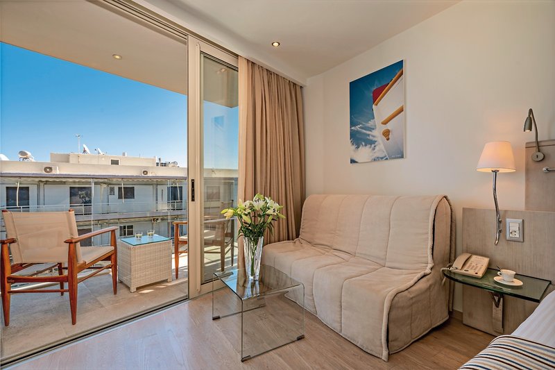- 31-35 qm, Suite, 2 separate Schlafzimmer, 1 Bad, Dusche, WC, Bademantel, Badeslipper, Haartrockner, Klimaanlage, individuell regulierbar, Safe, 1 TV (Sat-TV, Flachbildschirm), Kaffeemaschine, Kaffee/Tee, Kühlschrank, Balkon (möbliert)