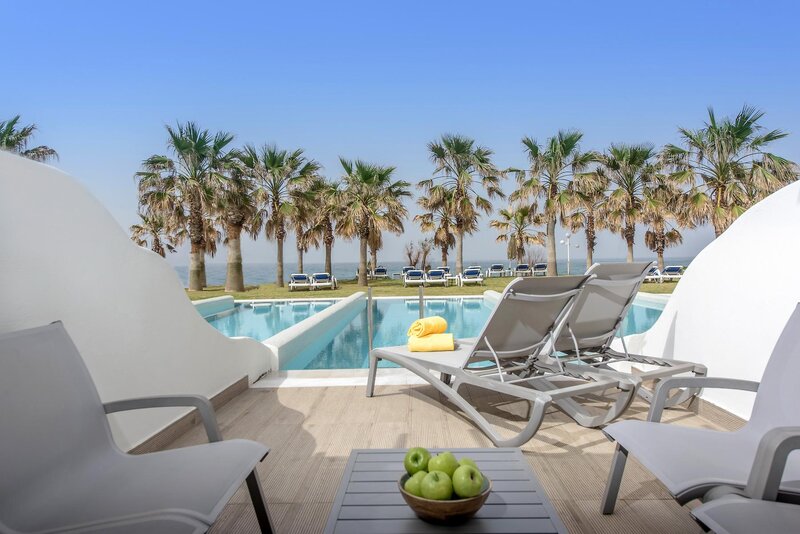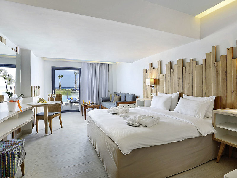 Besonderer Luxus für Ihren Urlaub: Suiten (SU, ca. 40 qm; unter HER319), 2 Schlafbereiche mit optischer Abtrennung, Klimaanlage, Kühlschrank, Großbild-TV, Telefon, Safe. Dusche, WC, Föhn, Bademäntel, Slipper. Terrasse mit Zugang zum Sharingpool, Seafront. Max. 3E+1K