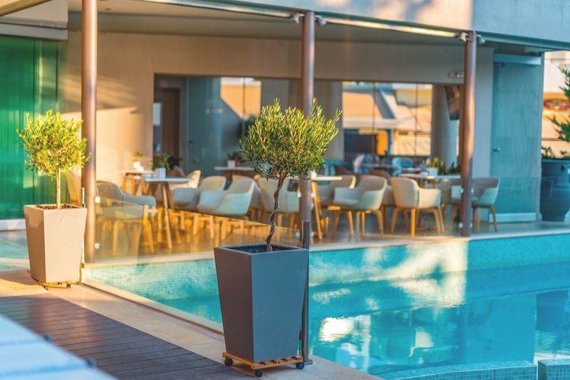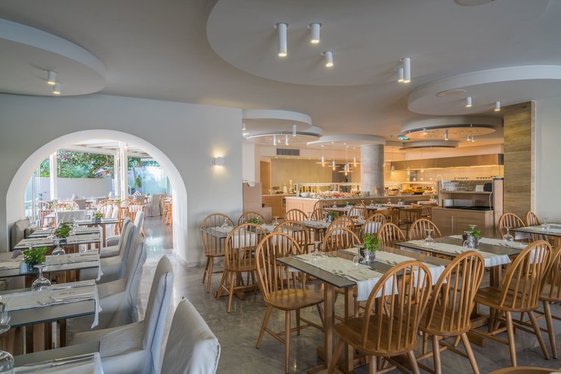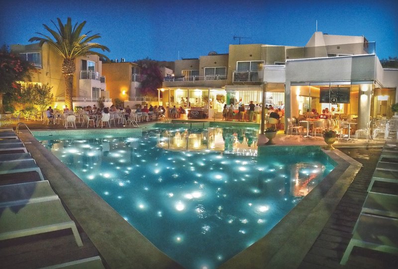 Ausstattung: Das im kretischen Bungalowstil erbaute Hotel mit insgesamt 137 modern eingerichteten Zimmern, die sich auf das Haupthaus und mehrere zweistöckige Nebengebäude (teilweise außerhalb der Anlage) verteilen, bietet seinen Gästen eine Lobby mit 24-h-Rezeption, Lounge mit Terrasse, TV-Ecke, Bibliothek, Internetecke, Bar, ein Hauptrestaurant sowie ein À-la-carte-Restaurant. Wi-Fi ist in den öffentlichen Bereichen inklusive. Im Außenbereich des Hotels befindet sich der Süßwasser-Swimmingpool mit Kinderbecken, Sonnenterrasse mit Liegen und Schirmen (inklusive), Sitzterrasse und die Pool-/Snackbar. Liegen und Schirme sind am Pool inklusive und am Strand gegen Gebühr erhältlich.