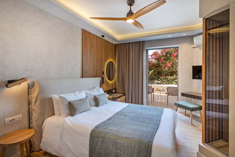 Doppelzimmer: Die modern und freundlich eingerichteten Zimmer verfügen über Dusche/WC, Föhn, diverse Pflegeprodukte aus Olivenöl, Klimaanlage, Telefon, Wi-Fi (inklusive), Mietsafe, Sat.-TV mit Musikkanal, Wasserkocher, Slipper, Kühlschrank sowie Balkon oder Terrasse (D). Die Zimmer befinden sich im Haupthaus und den Nebengebäuden.