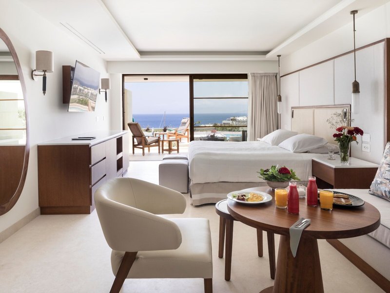 - Premium Junior Family Suite (JSM1), Suite, Nichtraucherzimmer, im Hauptgebäude, Meerblick, ca. 45 m², letzte Komplettrenovierung 2025, Gesamtanzahl der Räume in diesem Zimmertyp: 1, Aufteilung wie folgt: kombiniertes Wohn-/Schlafzimmer, 1 Queen Size Bett, 1 Schlafsofa, Babybett: ohne Gebühr, Moskitonetz, Klimaanlage: ohne Gebühr, kalt, warm, Fußboden: Fliesenboden, Safe: ohne Gebühr, Sofa, Schreibtisch, Nespressomaschine, Kaffee-/Teezubereiter, Minibar: gegen Gebühr, Softdrinks: gegen Gebühr, Wasser: ohne Gebühr, alkoholische Getränke: gegen Gebühr, Snacks: gegen Gebühr, Minibarauffüllung, Internet: WLAN/WiFi: ohne Gebühr, Fernseher: Flatscreen, deutsches Programm, Roomservice: gegen Gebühr, Reinigungsservice: ohne Gebühr, separate Dusche, Badewanne, WC, Bademantel: ohne Gebühr, Slipper: ohne Gebühr, Föhn, Kosmetikspiegel, Balkon oder Terrasse: mit Sitzgelegenheit