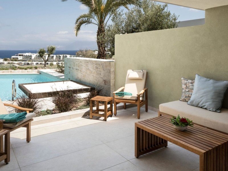 - Premium Junior Suite Shared Pool (JSM2), Suite, Nichtraucherzimmer, im Hauptgebäude, Meerblick, ca. 45 m², letzte Komplettrenovierung 2025, Gesamtanzahl der Räume in diesem Zimmertyp: 1, Aufteilung wie folgt: kombiniertes Wohn-/Schlafzimmer, 1 Queen Size Bett, 1 Schlafsofa, Babybett: ohne Gebühr, Moskitonetz, Klimaanlage: ohne Gebühr, zentral gesteuert, kalt, warm, Fußboden: Fliesenboden, Safe: ohne Gebühr, Sofa, Schreibtisch, Nespressomaschine, Kaffee-/Teezubereiter, Minibar: gegen Gebühr, Softdrinks: gegen Gebühr, Wasser: ohne Gebühr, alkoholische Getränke: gegen Gebühr, Snacks: gegen Gebühr, Minibarauffüllung, Internet: WLAN/WiFi: ohne Gebühr, Fernseher: Flatscreen, deutsches Programm, Roomservice: gegen Gebühr, Reinigungsservice: ohne Gebühr, Badewanne, WC, Bademantel: ohne Gebühr, Slipper: ohne Gebühr, Föhn, Kosmetikspiegel, Terrasse: mit Liegestühlen, mit Sitzgelegenheit, mit direktem Poolzugang