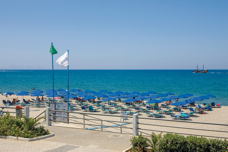 - Sandstrand: von der Anlage getrennt durch Promenade, Sonnenschirme (kostenpflichtig), Liegen (kostenpflichtig), Strandtuch/Badetuch