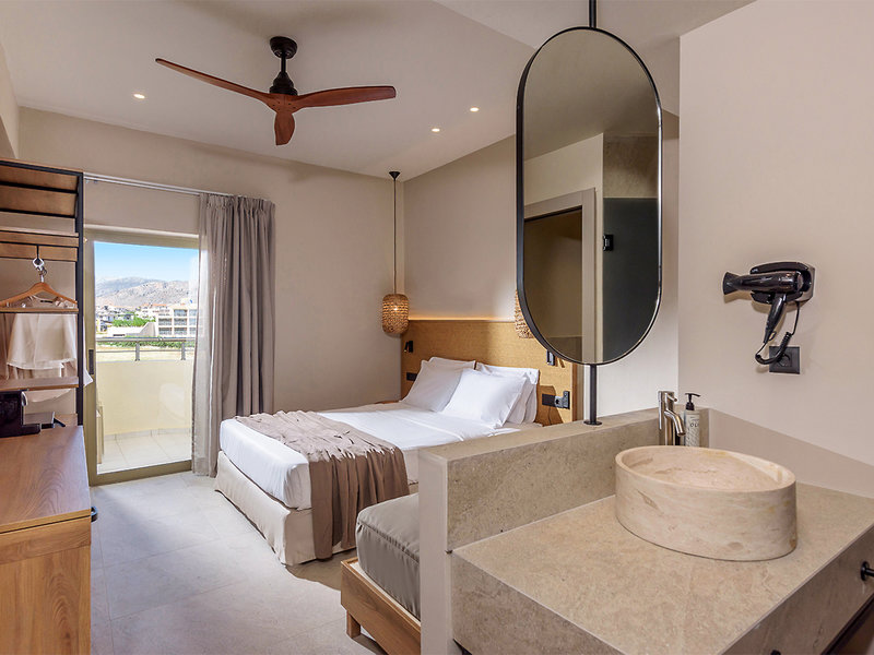 Superior-Doppelzimmer (DSM, ca. 20 qm), renoviert (ab 24.04.26), Klimaanlage, Kühlschrank, Kaffee-/Teezubereiter, WLAN, TV, Telefon, Safe (geg. Gebühr bis 30.10.25). Dusche, WC und Föhn. Balkon/Terrasse mit seitlichem Meerblick. Max. 3E