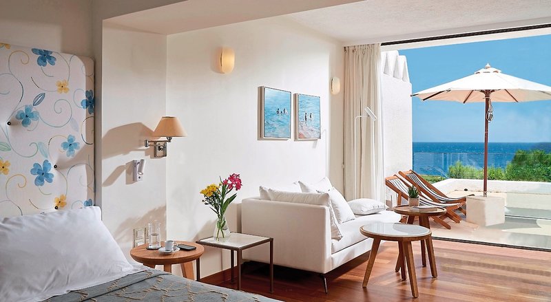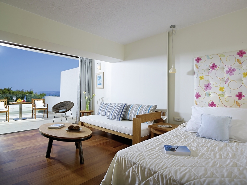 Die Zimmer: Bei der Einrichtung der 137 Zimmer, Suiten und Villen wurde großen Wert auf Individualität und Exklusivität gelegt. Naturmaterialien gepaart mit der Liebe zum Detail spiegeln die Schönheit eines kretischen Dorfes wider. Mit King-Size Bett oder Twin-Betten inkl. Kissenauswahl, Marmorbad mit separatem WC, WLAN (ohne Gebühr), Satelliten-TV, Kaffeemaschine, Teeauswahl, Klimaanlage, Telefon, Safe, Minibar, Bademantel, Slipper, Balkon/Terrasse.