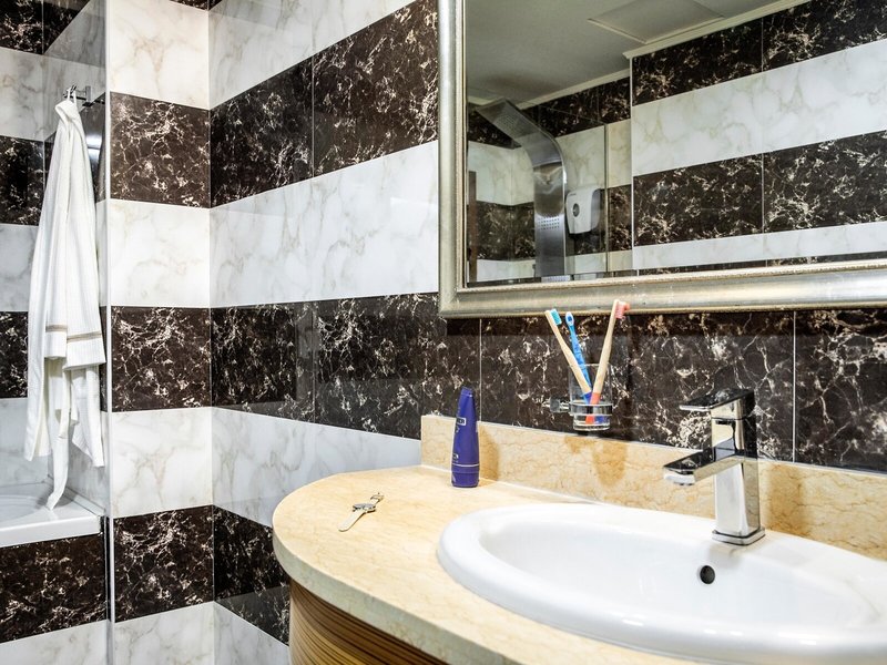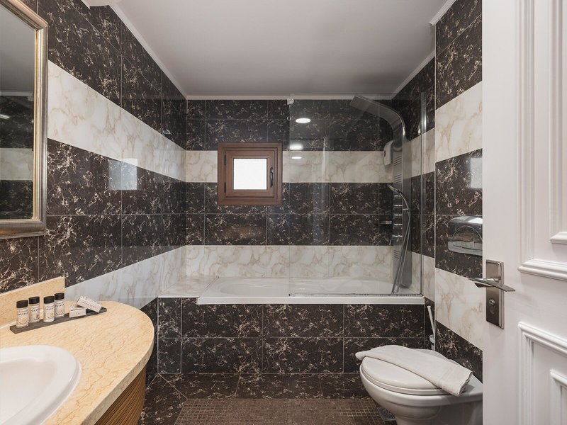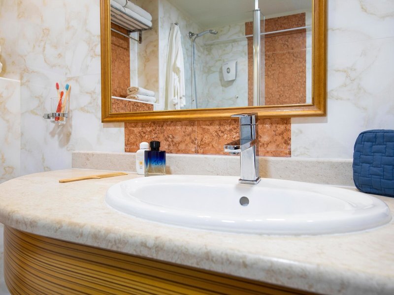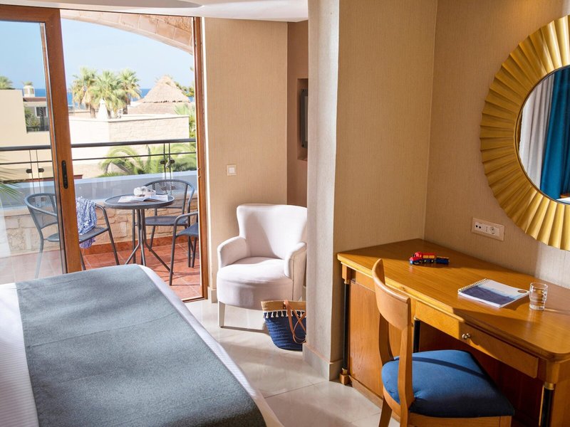 - Dvojlôžková izba s bočným výhľadom na more (DZX2), dvojlôžková izba, v hlavnej budove, v prístavbe, bočný výhľad na more, cca 25 m², 1 manželská posteľ (180x200 cm), 1 rozkladacia pohovka (80x190 cm), klimatizácia: centrálne ovládaná, poschodie: dlažba, trezor, písací stôl, žehliaca doska, chladnička, kávovar/čajník, rýchlovarná kanvica, telefón, internet: WLAN/WiFi: zdarma, TV: plochá obrazovka, v spálni, satelitná TV, vaňa, WC, sušič vlasov , balkón alebo terasa: s posedením