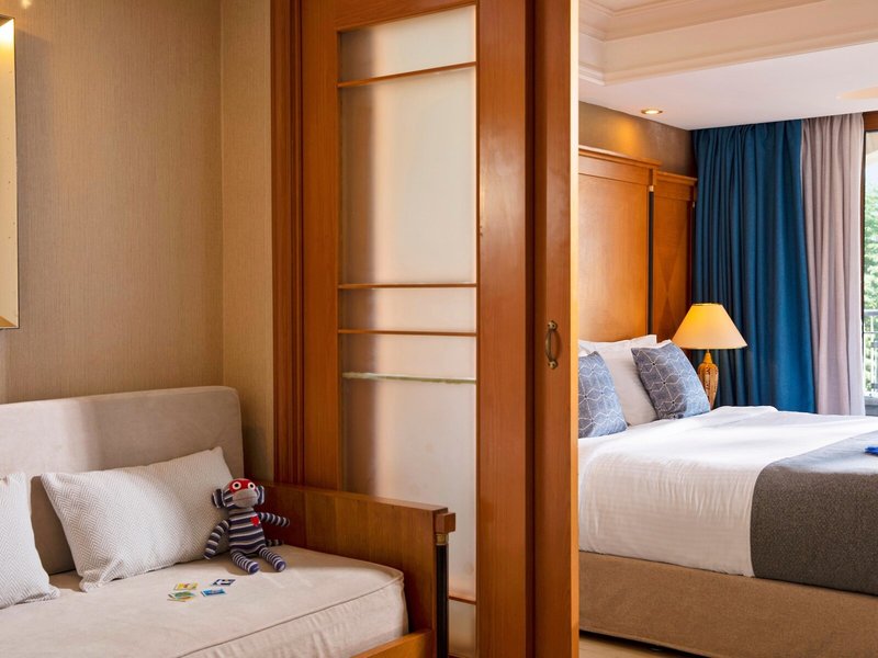 - Family Side Sea View (FZX2), Familienzimmer, im Hauptgebäude, im Nebengebäude, seitlicher Meerblick, ca. 30 m², bestehend aus 2 Zimmern, optisch getrennt durch Schiebetür, 1 Schlafzimmer, 1 Doppelbett (180x200cm), 2 Schlafsofas (80x190cm), Klimaanlage: zentral gesteuert, Fußboden: Fliesenboden, Safe, Schreibtisch, Bügelbrett, Kühlschrank, Kaffee-/Teezubereiter, Wasserkocher, Telefon, Internet: WLAN/WiFi: ohne Gebühr, Fernseher: Flatscreen, im Schlafzimmer, Sat-TV, Badewanne, WC, Föhn, Balkon oder Terrasse: mit Sitzgelegenheit