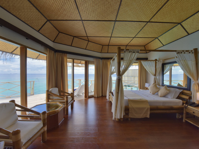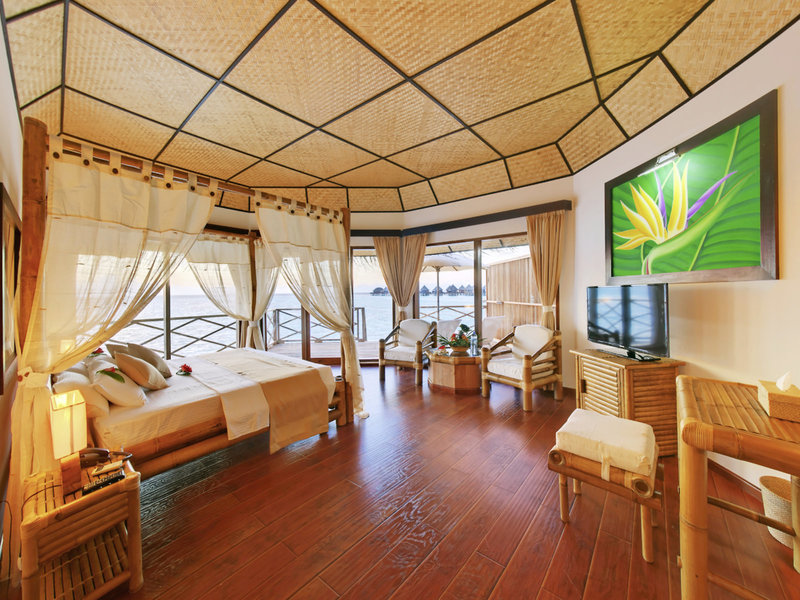 - Superior Water Bungalow (BUM2), Wasserbungalow, Nichtraucherzimmer, Lagunenseite, Meerblick, Lagunenblick, ca. 65 m², letzte Komplettrenovierung 2014, Gesamtanzahl der Räume in diesem Zimmertyp: 1, Aufteilung wie folgt: kombiniertes Wohn-/Schlafzimmer, 1 Doppelbett, Babybett: ohne Gebühr, Moskitonetz, Klimaanlage: ohne Gebühr, individuell regelbar, kalt, Fußboden: Parkett, Safe: ohne Gebühr, Sitzecke, Sofa, Kühlschrank: ohne Gebühr, Kaffee-/Teezubereiter, Wasserkocher, Telefon, Internet: WLAN/WiFi: ohne Gebühr, Fernseher: Flatscreen, im Schlafzimmer, Sat-TV, Roomservice: täglich, gegen Gebühr, Reinigungsservice: täglich, ohne Gebühr, separate Dusche, Regendusche, Badewanne, separates WC, Bademantel: ohne Gebühr, Föhn, Terrasse: mit Liegen, mit Sitzgelegenheit