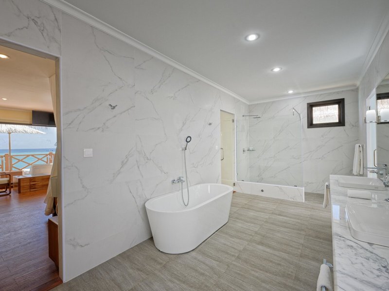 - Superior Water Bungalov (BUM2), vodný bungalov, nefajčiarska izba, strana lagúny, výhľad na more, výhľad na lagúnu, cca 65 m², posledná kompletná rekonštrukcia v roku 2014, celkový počet izieb v tomto type izby: 1, rozloženie: kombinovaná obývačka/spálňa, 1 manželská posteľ, detská postieľka: bezplatne, poschodie: zdarma, sedacia súprava, klimatizácia, klimatizácia, sedacia súprava zdarma, sedacia súprava: klimatizácia chladnička: zadarmo, kávovar/čajník, rýchlovarná kanvica, telefón, internet: WLAN/WiFi: zadarmo, TV: plochá obrazovka, v spálni, satelitná TV, izbová služba: denne, za poplatok, upratovanie: denne, zadarmo, samostatná sprcha, dažďová sprcha, vaňa, samostatné WC, župan: zadarmo, sušič vlasov, terasa: s ležadlami, s posedením