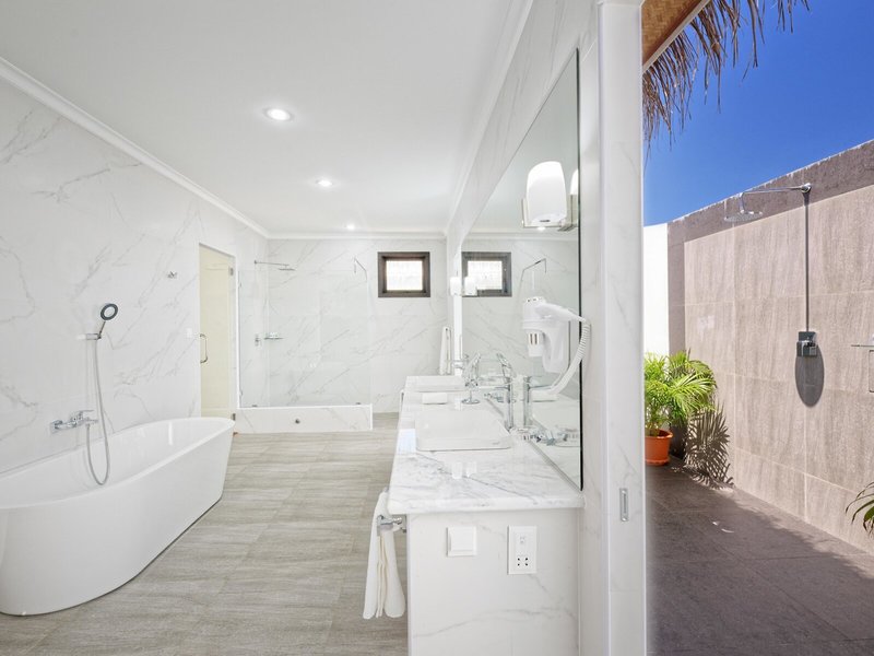 - Premium Water Bungalow (BUM3), Wasserbungalow, Nichtraucherzimmer, Lagunenseite, Meerblick, Lagunenblick, ca. 78 m², letzte Komplettrenovierung 2023, letzte Teilrenovierung 2023, Gesamtanzahl der Räume in diesem Zimmertyp: 1, Aufteilung wie folgt: kombiniertes Wohn-/Schlafzimmer, 1 Doppelbett, 1 Zustellbett, Babybett: ohne Gebühr, Moskitonetz, Klimaanlage: ohne Gebühr, individuell regelbar, kalt, Fußboden: Parkett, Safe: ohne Gebühr, Sofa, Schreibtisch, Kühlschrank: ohne Gebühr, Kaffee-/Teezubereiter, Wasserkocher, Telefon, Internet: WLAN/WiFi: ohne Gebühr, Fernseher: Flatscreen, im Schlafzimmer, Sat-TV, Roomservice: täglich, gegen Gebühr, Reinigungsservice: täglich, ohne Gebühr, separate Dusche, Regendusche, Badewanne, separates WC, Bademantel: ohne Gebühr, Föhn, Terrasse: mit Liegestühlen, mit Liegen, mit Sitzgelegenheit