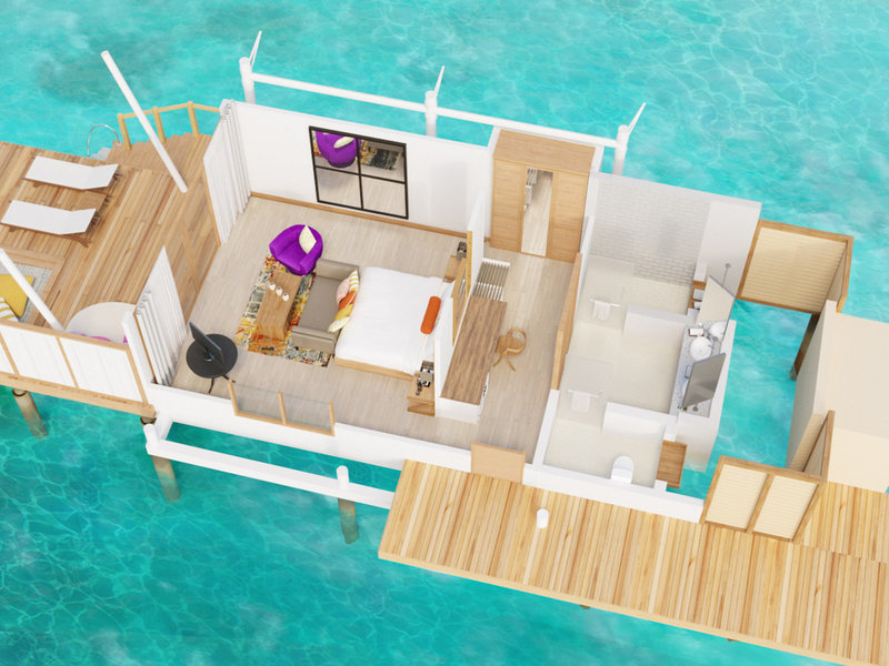 - Water Bungalow (BUM1), Bungalow, Meerseite, Meerblick, ca. 85 m², letzte Komplettrenovierung 2019, letzte Teilrenovierung 2015, Gesamtanzahl der Räume in diesem Zimmertyp: 1, Aufteilung wie folgt: kombiniertes Wohn-/Schlafzimmer, 1 King Size Bett, Babybett: ohne Gebühr, Anfrage & Reservierung notwendig, Klimaanlage: ohne Gebühr, Januar - Dezember; saisonabhängig; wetterabhängig, individuell regelbar, Safe: ohne Gebühr, Sofa, Schreibtisch, Kaffeemaschine, Kaffee-/Teezubereiter, Minibar: gegen Gebühr, Softdrinks: gegen Gebühr, Wasser: gegen Gebühr, alkoholische Getränke: gegen Gebühr, Snacks: gegen Gebühr, Telefon, Internet: WLAN/WiFi: ohne Gebühr, Fernseher: Flatscreen, im Schlafzimmer, Sat-TV, Roomservice: täglich, gegen Gebühr, Reinigungsservice: täglich, ohne Gebühr, Dusche, WC, Bademantel: ohne Gebühr, Slipper: ohne Gebühr, Föhn, Terrasse: mit Liegen, mit Sitzgelegenheit
