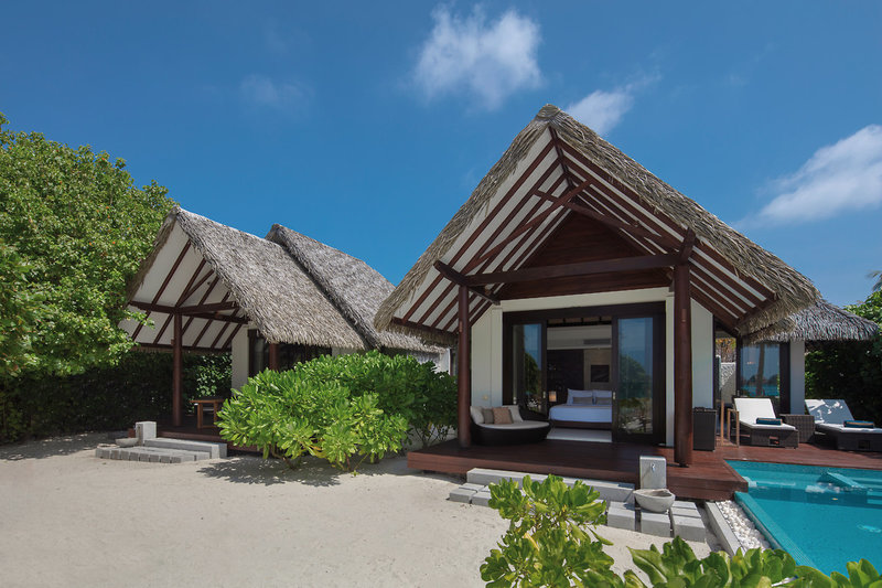 - 121-150 qm, Villa, freistehend, Strandlage, Sonnenuntergangsseite, Meerblick, nach oben halb offenes Bad, Dusche, Whirlwanne, Außendusche, WC, Haartrockner, Klimaanlage, Ventilator, Minibar, Auffüllung täglich, Safe, TV, WLAN, Wasserkocher, Espressomaschine, Kaffee/Tee, Terrasse (möbliert), direkter Strandzugang, Privatpool, bei Ankunft im Zimmer Flasche Sekt