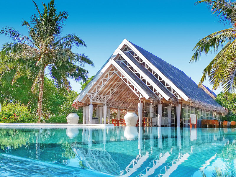 Lage: Luxuriöses Inselresort (ca. 1.800 x 200 m, Süd-Ari-Atoll). Der Transfer erfolgt mit Wasserflugzeug (Transferzeit vom Flughafen Male ca. 25 Minuten).