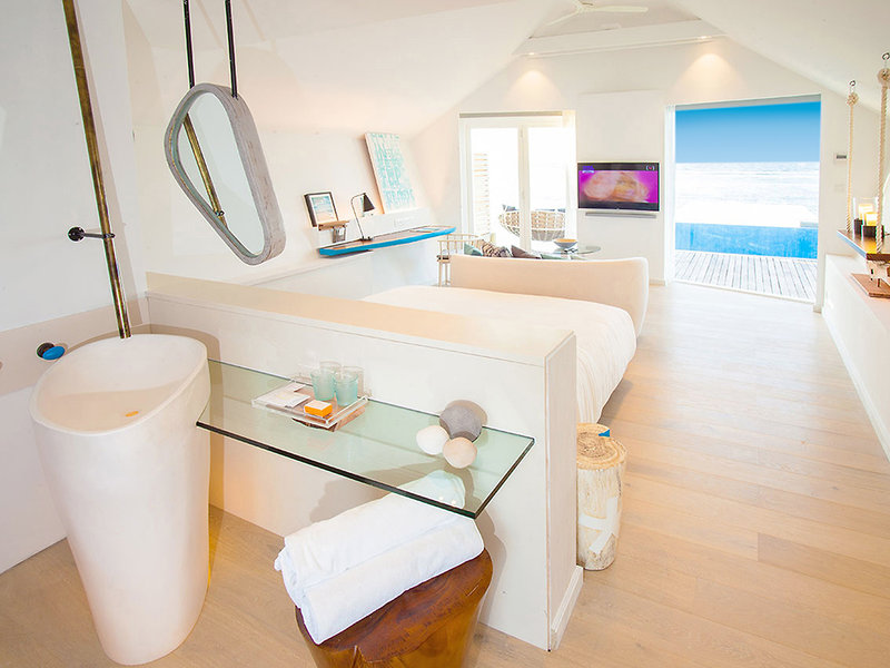 Vodná vila (WVI, cca 98 m²), postavená na koloch, klimatizácia, stropný ventilátor, trezor, telefón, TV, Wi-Fi, minibar (za poplatok), kávovar/čajník, kúpeľňa/sprcha, WC, fén. Terasa, ležadlá, výhľad na more. Max. 3 dospelí/2 dospelí + 2 deti