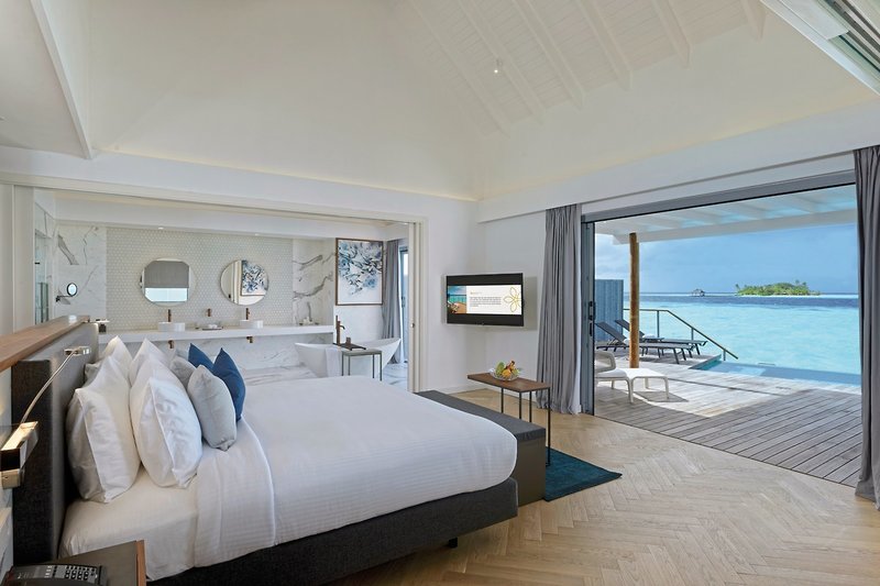 - 121-150 qm, Villa, freistehend, Sonnenuntergangsseite, Wasserbungalow (auf Stelzen über der Lagune), Dusche, Badewanne, WC, Bademantel, Haartrockner, Klimaanlage, Ventilator, Minibar kostenpflichtig, Safe, TV, Wasserkocher, Espressomaschine, Kaffee/Tee, Terrasse (möbliert), direkter Meerzugang, Privatpool
