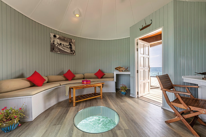 - 71-80 qm, Villa, freistehend, Sonnenaufgangsseite, Wasserbungalow (auf Stelzen über der Lagune), Meerblick, separates Schlafzimmer, separater Wohnraum, Dusche, Außendusche, WC, Bademantel, Haartrockner, Klimaanlage, Ventilator, Minibar kostenpflichtig, Safe, TV, WLAN, Wasserkocher, Kaffee/Tee, Terrasse (möbliert), Dachterrasse (möbliert), direkter Meerzugang