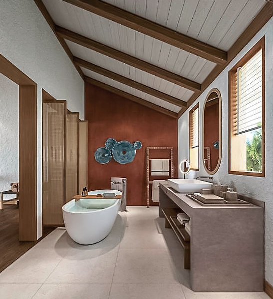 - 46-50 qm, Villa, Deluxe, Sonnenuntergangsseite, Sitzecke, nach oben halb offenes Bad, Badewanne, Regendusche, WC, Haartrockner, Klimaanlage, Ventilator, Minibar kostenpflichtig, Safe, TV, Bluetooth-Lautsprecher, WLAN, Wasserkocher, Espressomaschine, Kaffee/Tee, Terrasse (möbliert)