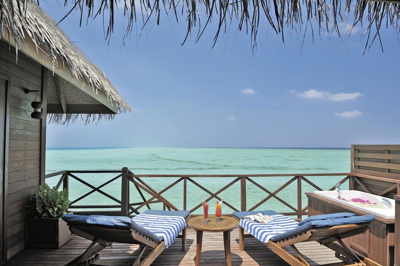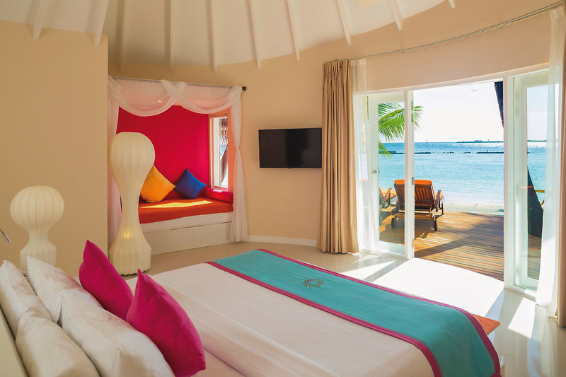 - 71-80 qm, Villa, freistehend, Sonnenuntergangsseite, Wasserbungalow (auf Stelzen über der Lagune), Meerblick, Ankleidebereich, Dusche, Badewanne, WC, Haartrockner, Klimaanlage, Ventilator, Minibar, Safe, Bügelbrett, Bügeleisen, TV, WLAN, Wasserkocher, Kaffee/Tee, Terrasse (möbliert), direkter Meerzugang