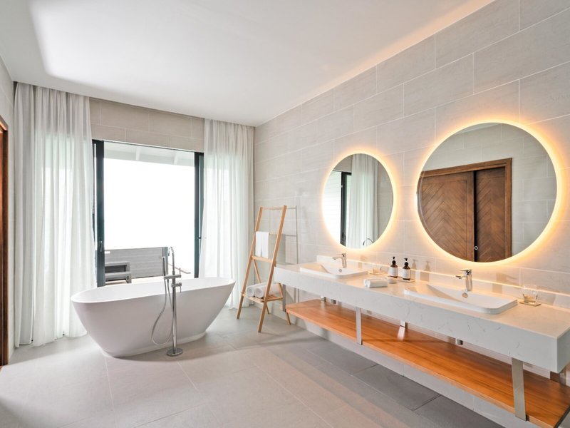 - Water Villa (VIM5), Wasserbungalow, Meerseite, Meerblick, ca. 125 m², Gesamtanzahl der Räume in diesem Zimmertyp: 1, Aufteilung wie folgt: kombiniertes Wohn-/Schlafzimmer, Babybett: ohne Gebühr, Anfrage notwendig, Klimaanlage: ohne Gebühr, Fußboden: PVC, Safe: ohne Gebühr, Deckenventilator, Sitzecke, Sofa, Schreibtisch, Bügeleisen, Bügelbrett, Nespressomaschine, Kaffee-/Teezubereiter, Wasserkocher, Minibar: gegen Gebühr, Softdrinks: gegen Gebühr, bei All Inclusive inklusive, Wasser, alkoholische Getränke: gegen Gebühr, Snacks: gegen Gebühr, Minibarauffüllung: täglich, Telefon, Internet: WLAN/WiFi: ohne Gebühr, Fernseher: Flatscreen, Sat-TV, Roomservice: täglich, gegen Gebühr, Reinigungsservice: täglich, ohne Gebühr, Dusche, Badewanne, WC, Bademantel: ohne Gebühr, Slipper: ohne Gebühr, Föhn, Terrasse: mit Liegestühlen, mit Sitzgelegenheit
