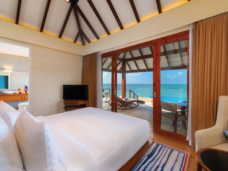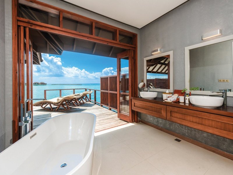 - Water Villa with Pool (VIM2), Villa, Nichtraucherzimmer, Meerseite, Meerblick, ca. 105 - 105 m², Gesamtanzahl der Räume in diesem Zimmertyp: 1, Aufteilung wie folgt: 1 Schlafzimmer, 1 King Size Bett, 1 Schlafsofa, Klimaanlage: ohne Gebühr, kalt, Fußboden: Parkett, Safe: ohne Gebühr, Deckenventilator, Sofa, Bügelbrett, Minibar: ohne Gebühr, Softdrinks: ohne Gebühr, Wasser: ohne Gebühr, alkoholische Getränke: ohne Gebühr, Snacks: ohne Gebühr, Minibarauffüllung: täglich, Internet: WLAN/WiFi: ohne Gebühr, Fernseher, Reinigungsservice: täglich, ohne Gebühr, Außendusche, Badewanne, Bademantel: ohne Gebühr, Slipper: ohne Gebühr, Föhn, Terrasse: mit Liegen, mit Private Pool