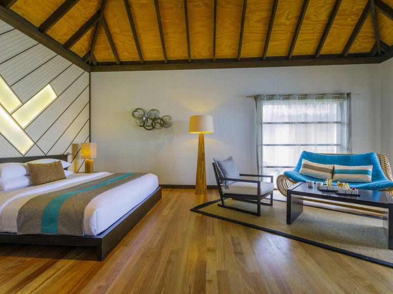 - Water Villa (BUM2), Wasserbungalow, Nichtraucherzimmer, Lagunenseite, Meerblick, Lagunenblick, ca. 112 m², Gesamtanzahl der Räume in diesem Zimmertyp: 1, Aufteilung wie folgt: kombiniertes Wohn-/Schlafzimmer, 1 Schlafzimmer, 1 King Size Bett (190x200cm), 1 Zustellbett (90x186cm), Babybett: ohne Gebühr, Anfrage nicht notwendig, Reservierung notwendig, Klimaanlage: ohne Gebühr, Januar - Dezember, individuell regelbar, kalt, Fußboden: Parkett, Safe: ohne Gebühr, Deckenventilator, Sofa, Schreibtisch, Bügeleisen, Bügelbrett, Nespressomaschine, Kaffee-/Teezubereiter, Wasserkocher, Minibar: gegen Gebühr, Softdrinks: gegen Gebühr, Wasser: ohne Gebühr, alkoholische Getränke: gegen Gebühr, Snacks: gegen Gebühr, Minibarauffüllung: täglich, Telefon, Internet: WLAN/WiFi: ohne Gebühr, Fernseher: Flatscreen, im Schlafzimmer, deutsches Programm, Deutsche Welle, Kabel-TV, Roomservice: täglich 24 Stunden, gegen Gebühr, Reinigungsservice: täglich, ohne Gebühr, Dusche, separate Dusche, Regendusche, Badewanne, WC, Bademantel: ohne Gebühr, Slipper: ohne Gebühr, Föhn, Kosmetikspiegel, Terrasse: mit Liegestühlen, mit Sitzgelegenheit