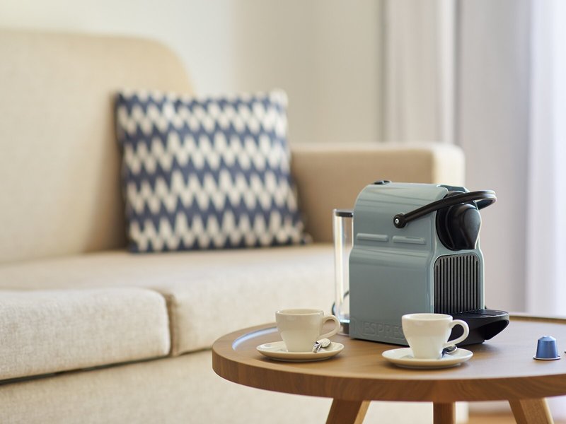 Standard Suite (Balkon o. Terrasse): Kitchenette mit Kühlschrank, Wasserkocher, Mikrowelle, Geschirr, Handtücher. TV, Telefon, Internet (geg. Geb.), Safe (geg. Geb.). Bad/Dusche, WC, Föhn. Balk./Terr. Max. 4E.