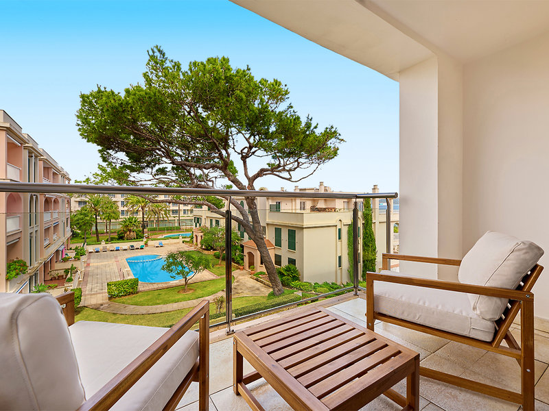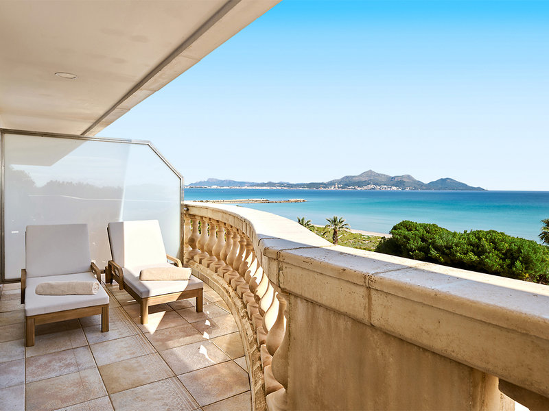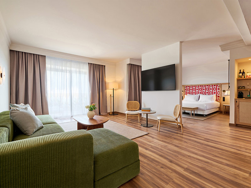Juniorsuite (JMS, ca. 80 qm), renoviert im Winter 24/25, Kingsize Bett, Schlafsofa, Klimaanlage, Minibar (gegen Gebühr), Nespresso®-Kaffeemaschine, Wasserkocher, bei Ankunft 1 Flasche Wasser (inkl.), 2 Smart-TV, Telefon, WLAN (inkl.), Safe. Badezimmer mit Dusche, WC, Föhn, Personenwaage, Bademantel, Slipper. Terrasse mit seitlichem Meerblick. Max. 3E+1K