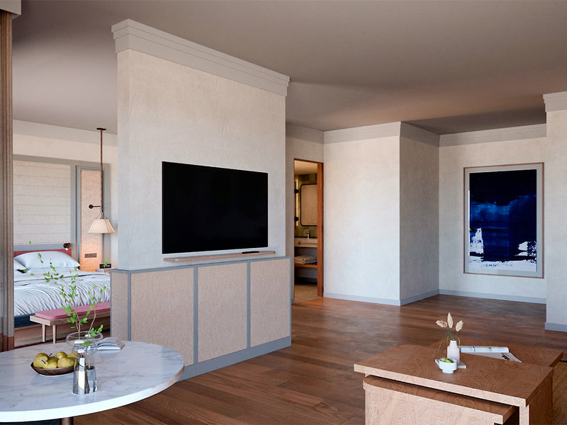Junior Suite (JS, cca 86 m²), zrekonštruovaný v zime 2024/25, manželská posteľ veľkosti king, rozkladacia pohovka, klimatizácia, minibar (za poplatok), kávovar Nespresso®, rýchlovarná kanvica, 1 fľaša vody pri príchode (v cene), 2 Smart TV, telefón, Wi-Fi (v cene), trezor. Kúpeľňa so sprchovacím kútom, WC, sušičom vlasov, váhou, županom a papučami. Terasa. Max. 3 dospelí + 1 dieťa.