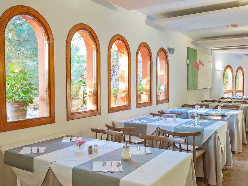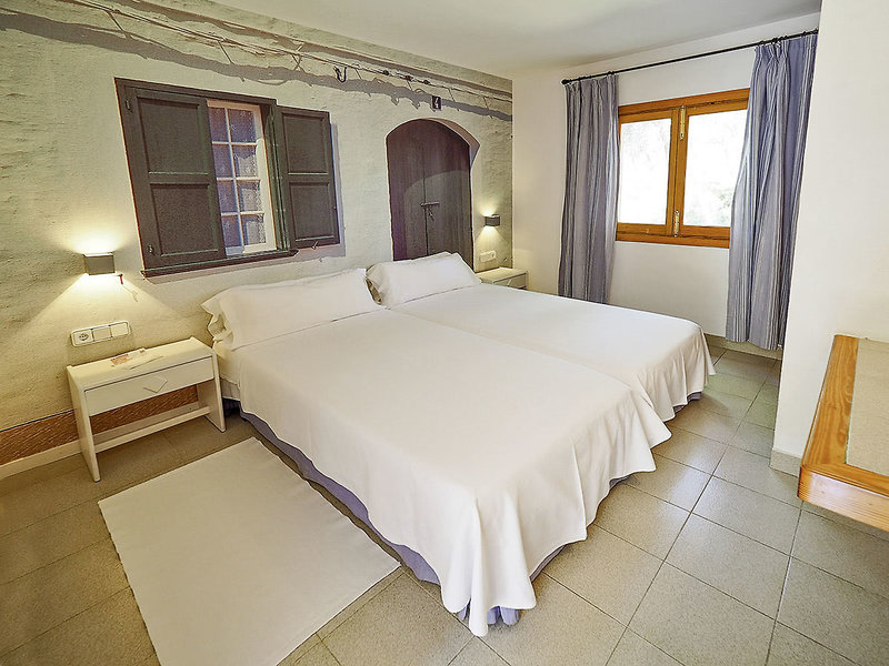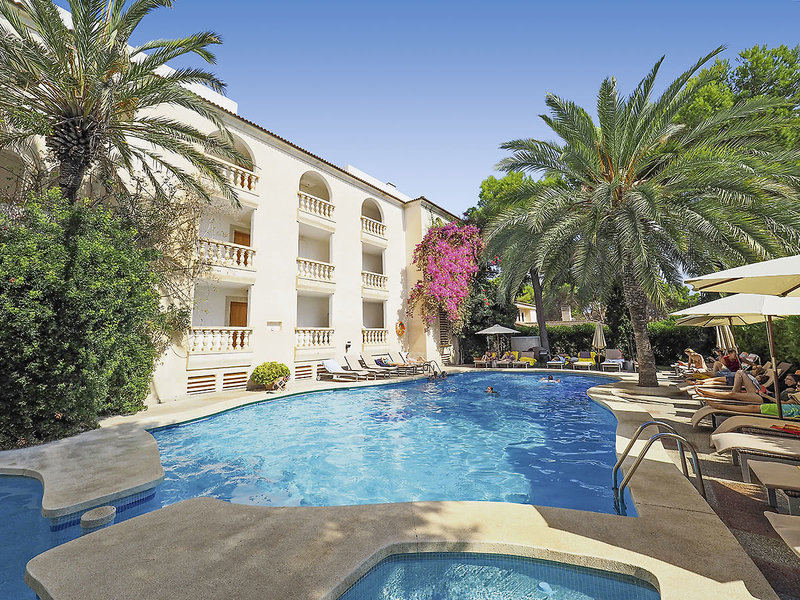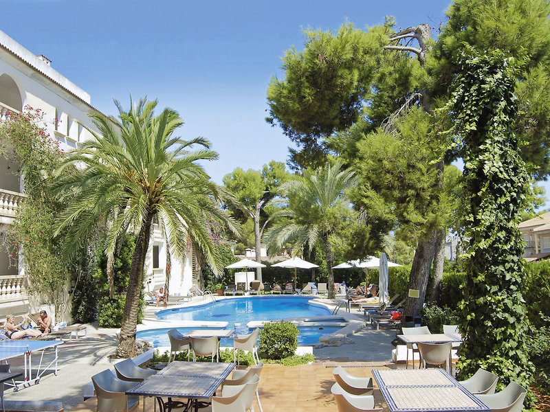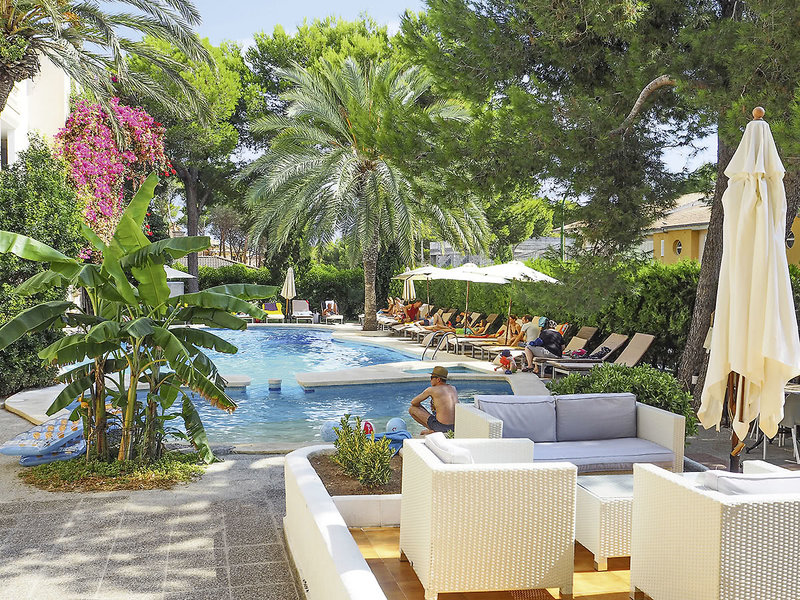 Ausstattung: Im mallorquinischen Villenstil erbaute , mit dem EU-Umweltzertifikat ausgezeichnete und familiär geführte Ferienanlage. Großer Garten, Pool mit integriertem Kinderpool, Sonnenterrasse, Liegen, Schirme (Badetücher inklusive), teilweise überdachte Pool-/Snackbar, Sitzterrasse. Auf dem Dach FKK-Terrasse. Empfangshalle, Rezeption, WLAN (inklusive), Aufenthaltsraum mit TV, Bar, Restaurant, Außenterrasse. E-Auto-Ladestation. Landeskategorie: 4 Sterne, 70 Zimmer, 3 Etagen, Lift.