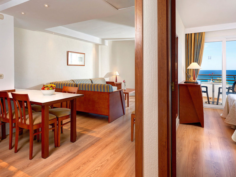 - 1 Bedroom apartment side sea / pool view (APX3), Appartement, im Hauptgebäude, seitlicher Meerblick, Poolblick, ca. 46 m², Gesamtanzahl der Räume in diesem Zimmertyp: 2, Aufteilung wie folgt: Wohnzimmer, 1 Schlafzimmer, 2 Einzelbetten (90x190cm), 2 Schlafsofas (80x190cm), Babybett: ohne Gebühr, Klimaanlage: zentral gesteuert, kalt, warm, Fußboden: Laminat, Safe: ohne Gebühr, Sofa, Kochnische, Kühlschrank, Mikrowelle, Kaffeemaschine, Toaster, Esstisch, Telefon, Internet: WLAN/WiFi: ohne Gebühr, Fernseher: Flatscreen, im Wohnbereich, im Schlafzimmer, Sat-TV, Reinigungsservice: Fr. - Mi., Badewanne oder Dusche, WC, Föhn, Kosmetikspiegel, Balkon: mit Sitzgelegenheit