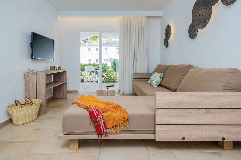 - 46-50 qm, Appartement, Gartenblick, 1 separates Schlafzimmer, kombinierter Wohn-/Schlafraum, Sofabett, 1 Bad, Dusche, Haartrockner, Klimaanlage, Safe, 1 TV (Sat-TV), WLAN, Kochnische, Wasserkocher, Mikrowelle, Kaffeemaschine, Toaster, Kühlschrank, Balkon oder Terrasse (möbliert), bei Ankunft im Zimmer Wasser