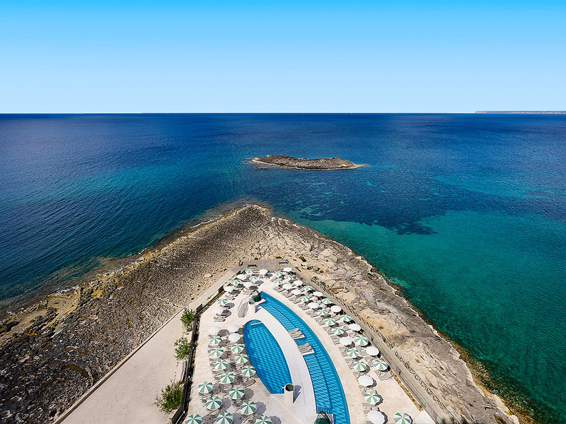 Ausstattung: Elegantes, im mediterranen Stil erbautes Ferienhotel, 2025 komplett renoviert, mit großem Pool, Sonnenterrasse, Liegen und Schirmen (Badetücher gegen Kaution), direkt oberhalb des Meeres, Pool-/Snackbar mit Außenbereich. Empfangshalle, Rezeption, Sitzgelegenheiten, WLAN (inklusive), Bars, Buffetrestaurant, À-la-carte-Restaurant, Dachterrasse mit Bar, kleinem Pool und Liegen. Landeskategorie: 5 Sterne, 145 Zimmer, 10 Etagen, 2 Lifte.