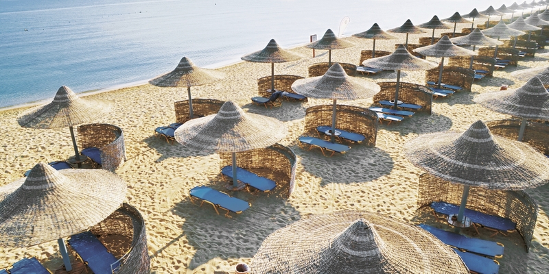 - Sandstrand: flach abfallend, gehört zur Anlage, ca. 300 m lang, Sonnenschirme, Liegen, Strandtuch/Badetuch