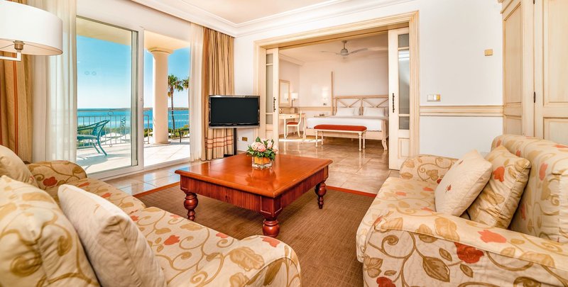 Prestige Suite: Die im Jahr 2023 renovierten Suiten sind elegant und komfortabel eingerichtet. Sie verfügen über einen kombinierten Wohn-/Schlafraum, ein Schrankbett und ein separates Schlafzimmer, 1 Bad/WC mit separater Dusche, 1 Bad/WC mit einem Whirlpool sowie einer Dusche mit Hydromassage, Bademäntel, Slipper und Föhn. Zudem sind die Suiten ausgestattet mit Kitchenette, Mikrowelle, Minibar (gegen Gebühr), Wasserkocher, TV, Telefon, Safe, Klimaanlage/Heizung, Sofabett sowie Balkon oder Terrasse mit Sonnenliegen (SP). Zimmergröße ca. 70 m².