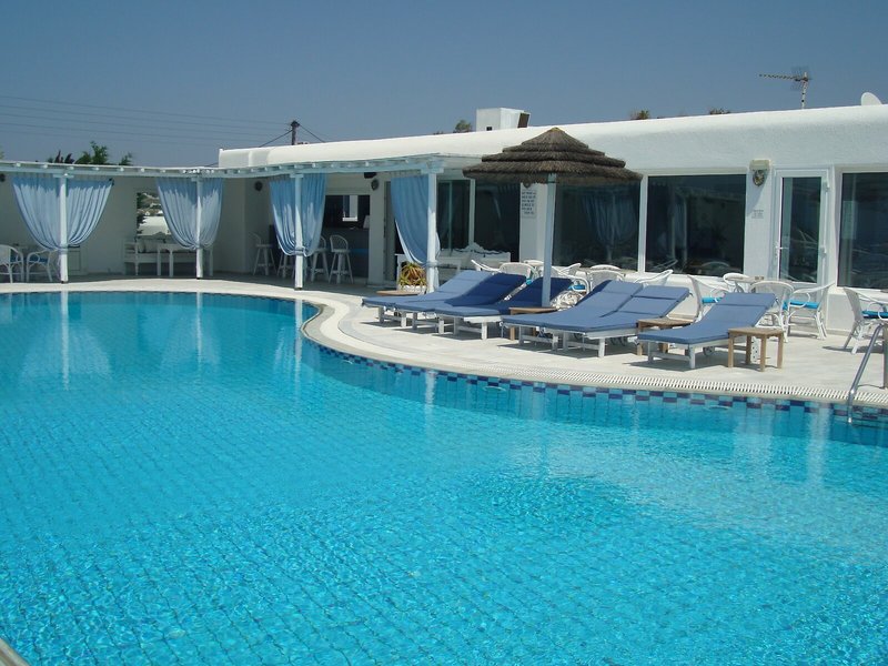 Lage & Umgebung Das Apartmenthotel befindet sich in der ruhigen und malerischen Gegend von Glastros, nur ca. 2 km von Mykonos-Stadt entfernt. Es liegt entfernt der Hauptstraße, die von der Hauptstadt zu Platis Gialos führt. Glastros bietet einen herrlichen Blick über das Ägäische Meer und auf die Sonnenuntergänge.