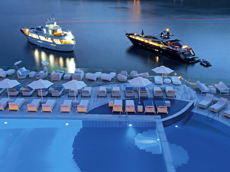 Toto vás čaká: Moderný sesterský hotel Mykonos Grand stojí na súkromnom ostrohu a je cenený pre svoju uvoľnenú, suverénnu atmosféru. Velikáni zo športu a filmu radi chodia večer do hotelového baru.