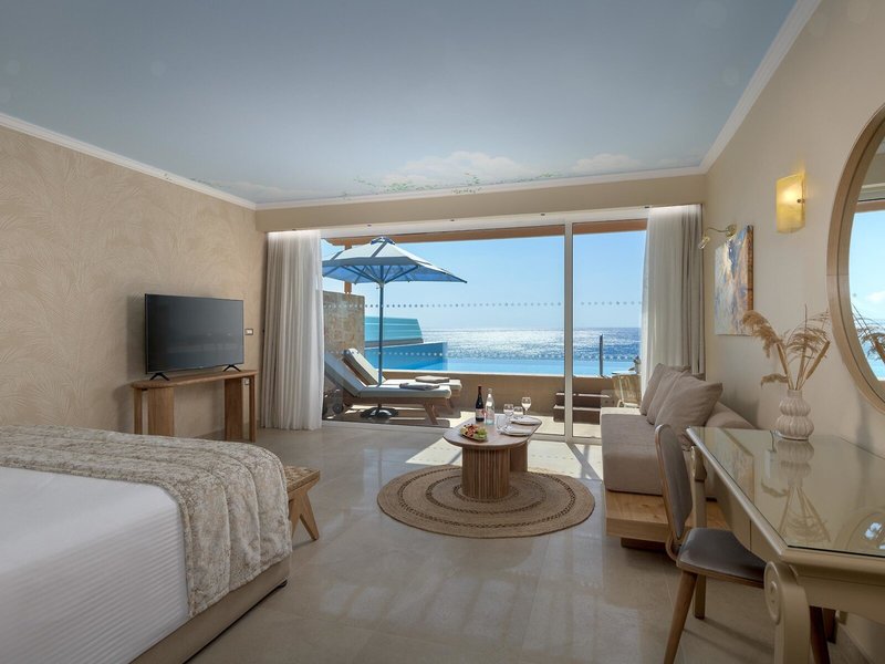 - Deluxe room sea view with pool (DZM3), Doppelzimmer, Nichtraucherzimmer, Meerblick, ca. 39 m², letzte Teilrenovierung 2023, Gesamtanzahl der Räume in diesem Zimmertyp: 1, Aufteilung wie folgt: kombiniertes Wohn-/Schlafzimmer, Babybett: ohne Gebühr, Anfrage notwendig, Klimaanlage: ohne Gebühr, individuell regelbar, kalt, warm, Safe: ohne Gebühr, Nespressomaschine, Kaffee-/Teezubereiter, Minibar: gegen Gebühr, bei All Inclusive inklusive, Minibarauffüllung: täglich, Telefon, Internet: WLAN/WiFi: ohne Gebühr, Fernseher: Flatscreen, deutsches Programm, Sat-TV, Roomservice: täglich, gegen Gebühr, Reinigungsservice: ohne Gebühr, Badewanne mit integriertem Whirlpool, WC, Bademantel: ohne Gebühr, Slipper: ohne Gebühr, Föhn, Terrasse: mit Liegestühlen, mit Sitzgelegenheit, mit Private Pool