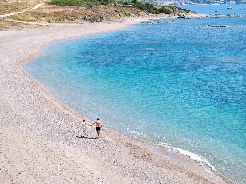 - Strand „Kiotari Beach“: Kies, Liegen, Sonnenschirme